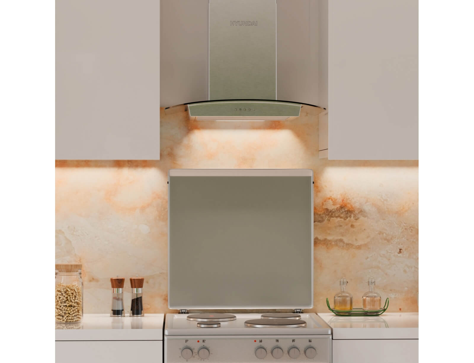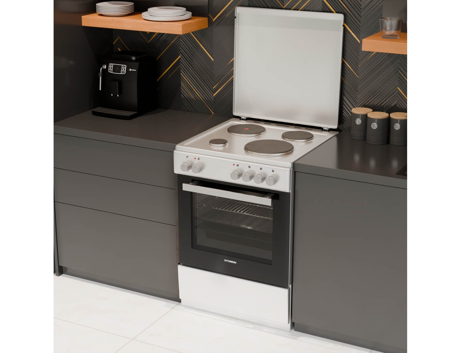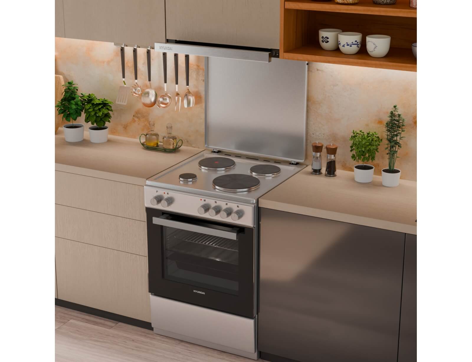 Κουζίνα Hyundai HCMU24V-7260E/S με ηλεκτρικό φούρνο, χωρητικότητα φούρνου 69 λίτρα, ενεργειακή κλάση Α, 4 εμαγιέ εστίες μαγειρέματος και 5 λειτουργίες ψησίματος.